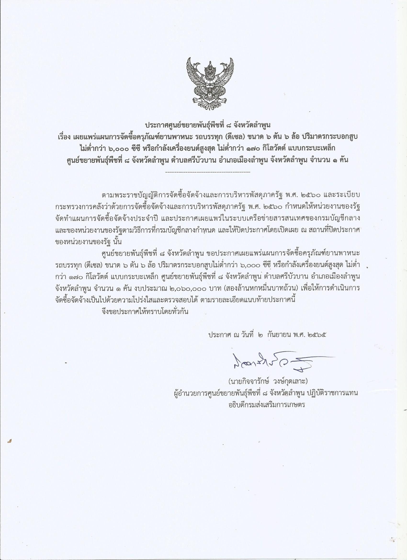 จัดซื้อครุภัณฑ์ยานพาหนะ รถบรรทุก (ดีเซล) ขนาด 6 ตัน 6 ล้อ ปริมาตรกระบอกสูบไม่ต่ำกว่า 6,000 ซีซี หรือกำลังเครื่องยนต์สูงสุด ไม่ต่ำกว่า 170 กิโลวัตต์ แบบกระบะเหล็ก ศูนย์ขยายพันธุ์พืชที่ 8 จังหวัดลำพูน ตำบลศรีบัวบาน อำเภอเมืองลำพูน จังหวัดลำพูน จำนวน 1 คัน